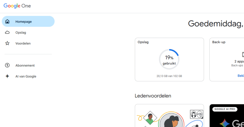 Bij een gratis Google-account krijg je standaard 15 GB opslagruimte, gedeeld tussen Gmail, Google Drive en Google Foto’s. Wie meer opslag nodig heeft, kan upgraden naar Google One. Abonnementen lopen van 100 GB tot meerdere terabytes en bieden extra functies naast pure opslag, zoals speciale ondersteuning en extra beveiligingsmogelijkheden.